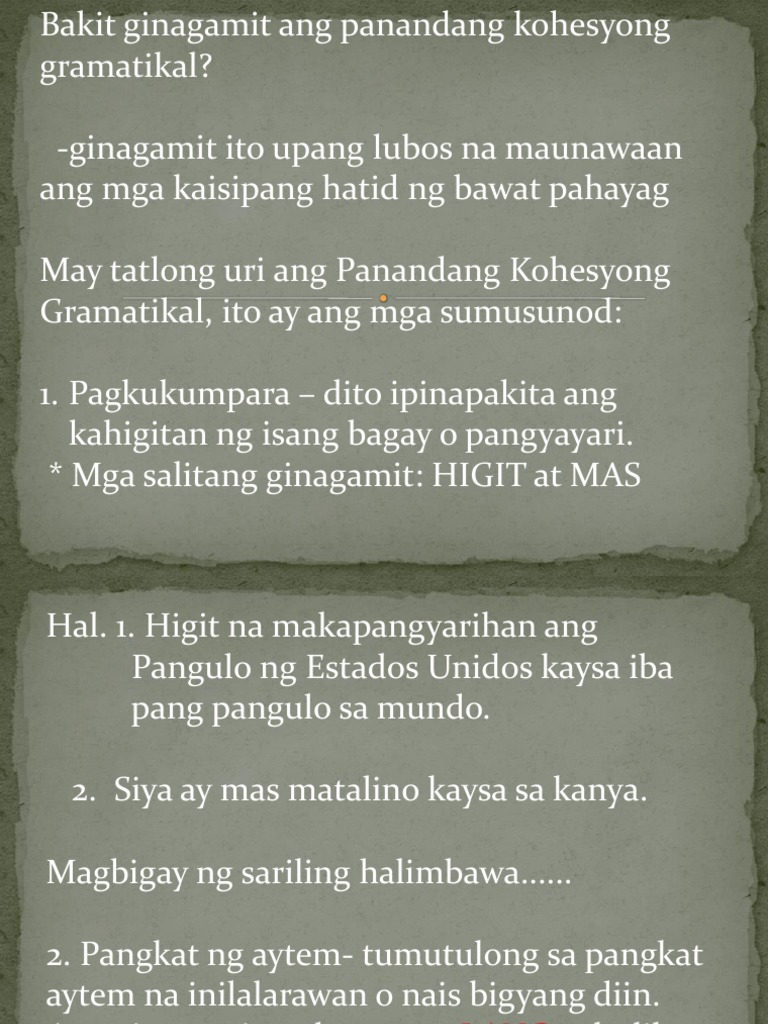 Ano ang mga halimbawa ng kohesyong gramatikal. -Tumutukoy sa mga salita o parirala. Kadalsan ang mga cohesive devices ay ating makikita sa pagsulat ng mga tekstong deskriptibo. Ano nga ba ito.