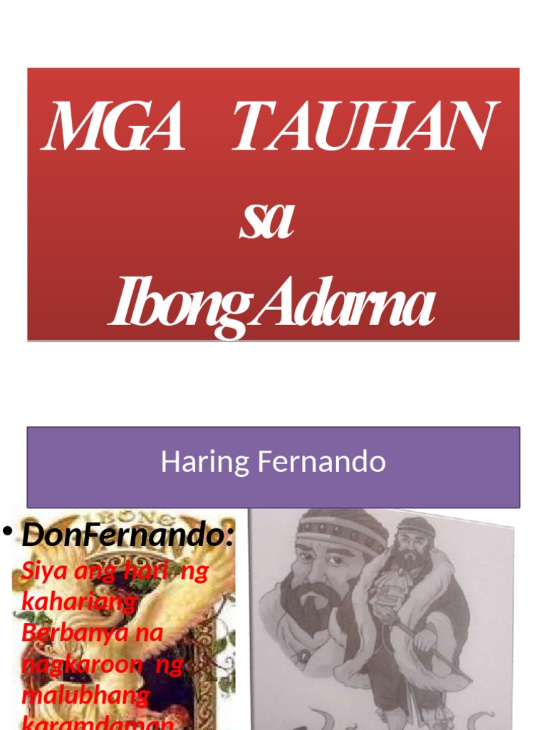 Ang Ibong Adarna ay isang korido na isinulat noong panahon ng Kastila na ngayon ay bahagi na ng Panitikan at Mitolohiyang PilipinoNoong panahon ng pananakop ng mga Kastila sa Pilipinas kilala ito sa pamagat na Corrido at Buhay na Pinagdaanan nang Tatlong Principeng Magcacapatid na Anac nang Haring Fernando at nang Reina Valeriana sa Cahariang Berbania. Mga Tauhan sa Ibong Adarna Don Pedro Don Juan Don Diego Haring Fernando Siya ang panganay na anak ni Haring Fernando. Ang epikong ito ay isang tulang pasalaysay na kinilala rin sa boung pamagat niya na Corrido at Buhay na Pinagdaanan nang Tatlong Principeng Magcacapatid na Anac nang Haring.