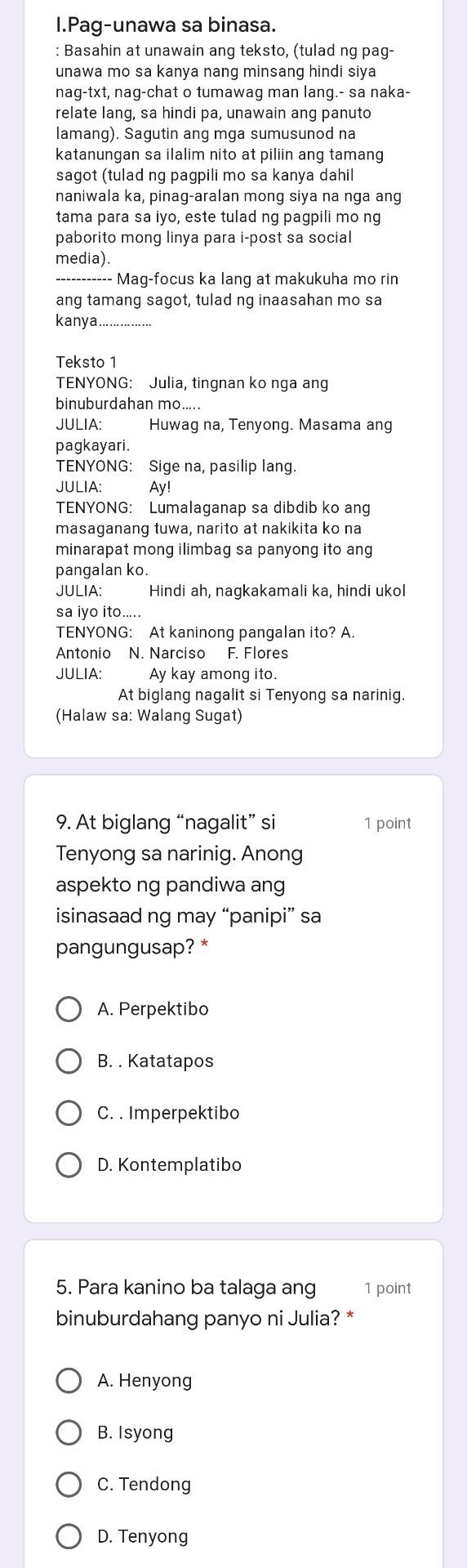 16 Questions Show answers. Nakabulagta fallen flat. Sumakay ako sa jeep papunta sa paaralan.
