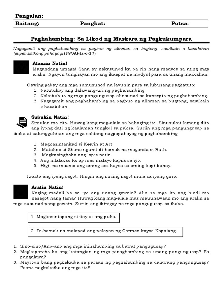 Ibahagi sa Twitter Ibahagi sa Facebook Ibahagi sa Pinterest. Gawain 1 - KUNG IKAW KAYA Isiping isa ka sa mga taong nabuhay sa daigdig noong sinaunang panahon. 1 on a question ano-ano ang dalawang uri ng paghahambing.